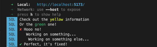 logSQL.info(`Check out the ${yellow(`yellow`)} information`)logSQL.info(`Or the ${green(`green`)} one!`)logSQL.error(`Hooo no!`)logSQL.info(`Working on something...`, { level: 3 })logSQL.info(`Working on something else...`, { level: 4 })logSQL.success(`Perfect, it's fixed!`)Will turn into that: